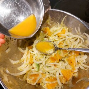 - Orange- Stückchen zum gehobelten Fenchel dazugeben.